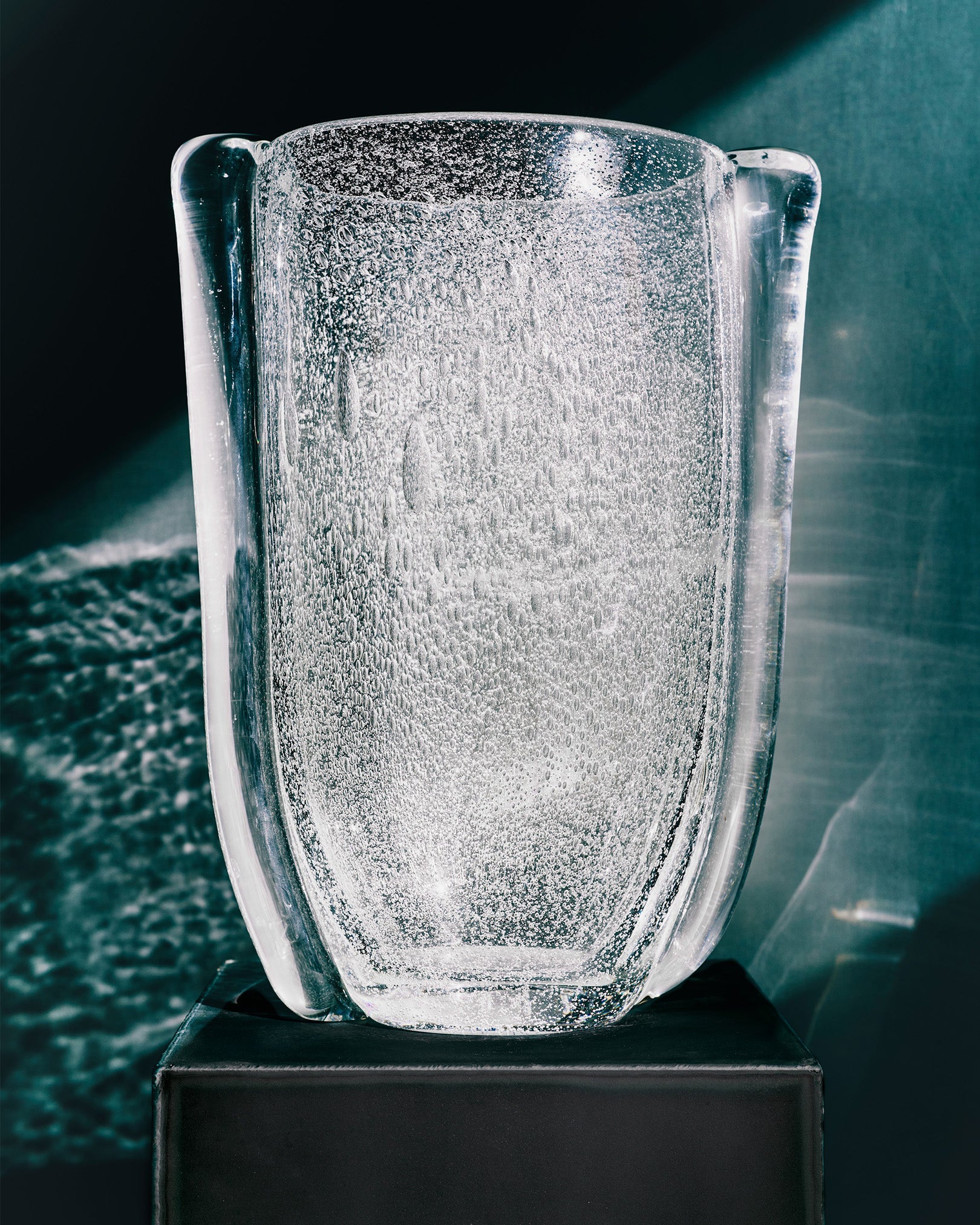 The Amphora Glass Vase is a refined expression of contemporary glass artistry, balancing technical mastery with historical references. The tall, elliptical shape brings a sense of stillness and refinement, while suspended air bubbles within the object evoke a sense of captured breath — a frozen moment from the glassblowing process.