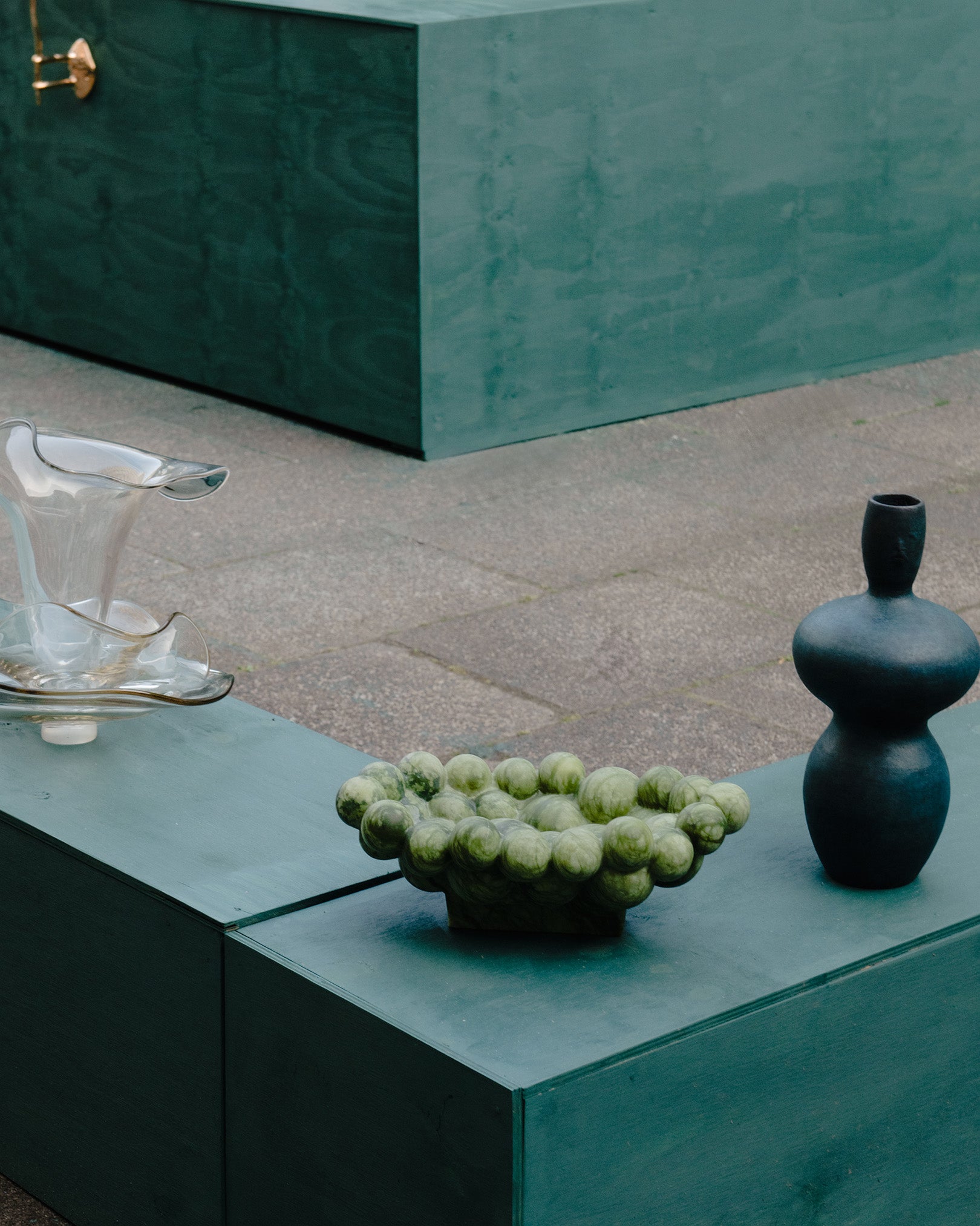 Collecta Verde is a sculptural fruit object - a bowl or tray to gather vitality and bloom, composed of clustered spheres, hand-carved from richly veined green marble. The name, Collecta Verde (“green gathering”) speaks to the object’s dual nature - at once architectural and biological, structured and soft. The clustering form appears as if grown together rather than shaped - an accretion of smooth volumes evoking seeds, cells, or a botanical bloom.