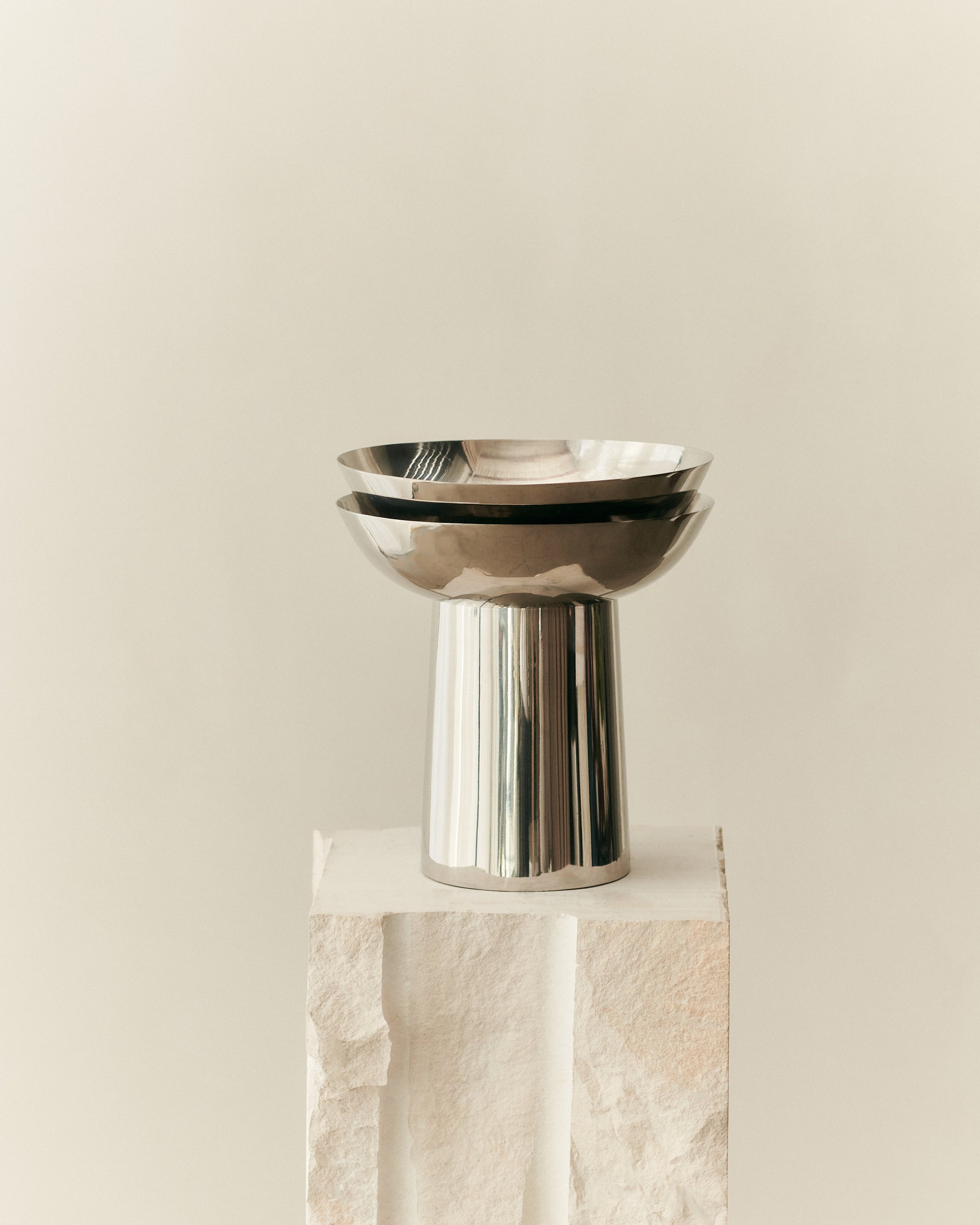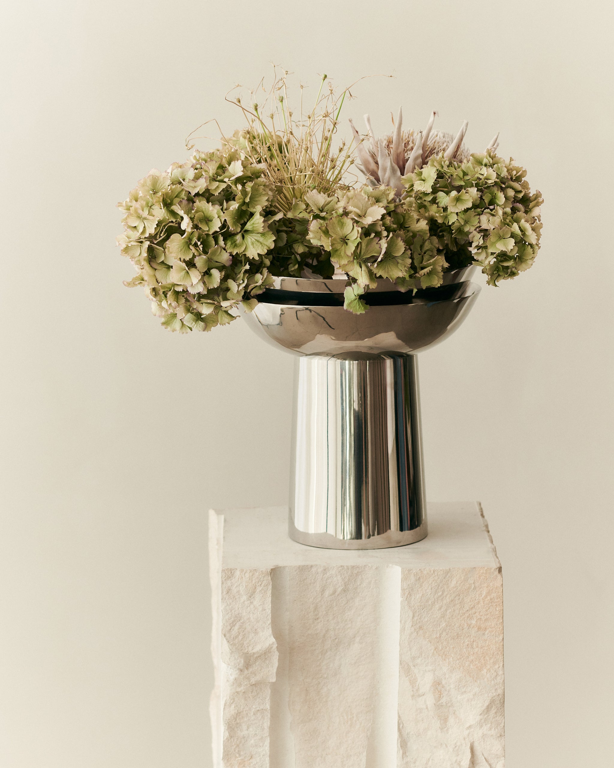 Our Fountain Vase series showcases a dynamic and playful geometric design. Each sculptural vase is meticulously hand-welded from polished stainless steel, featuring a distinctive crown. The array evokes a sense of fluid circularity, reminiscent of a fountain, symbolizing energy and perpetual continuity.