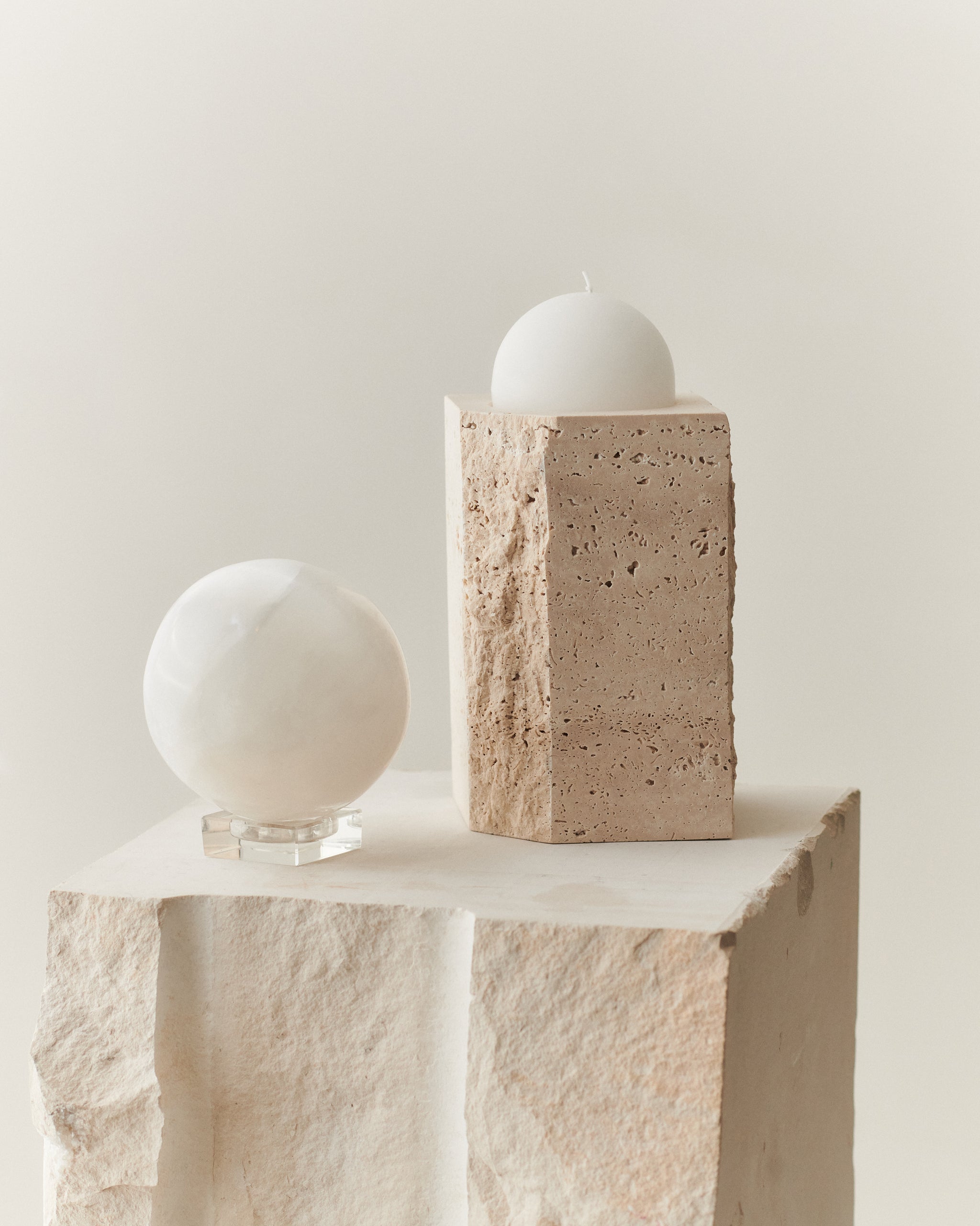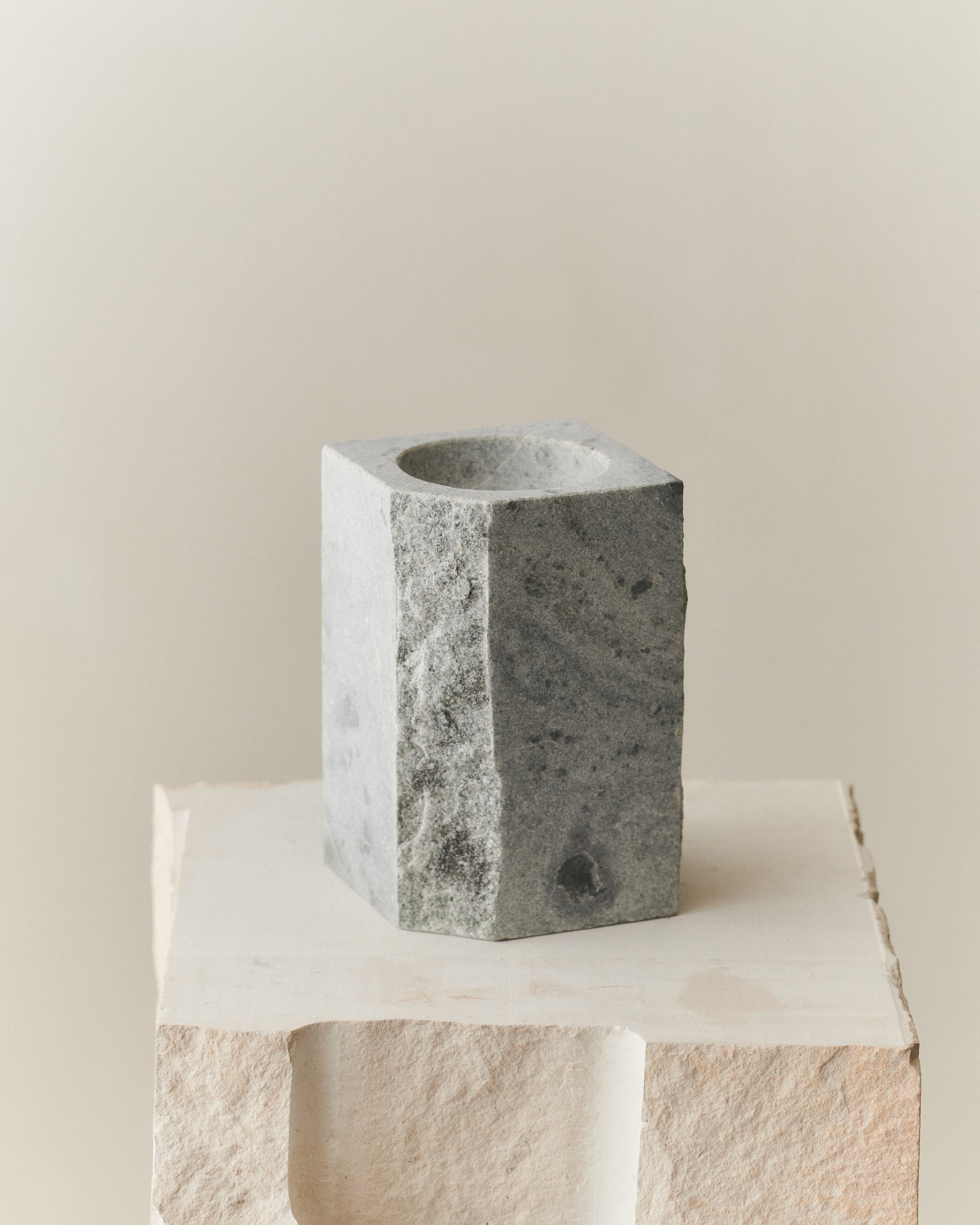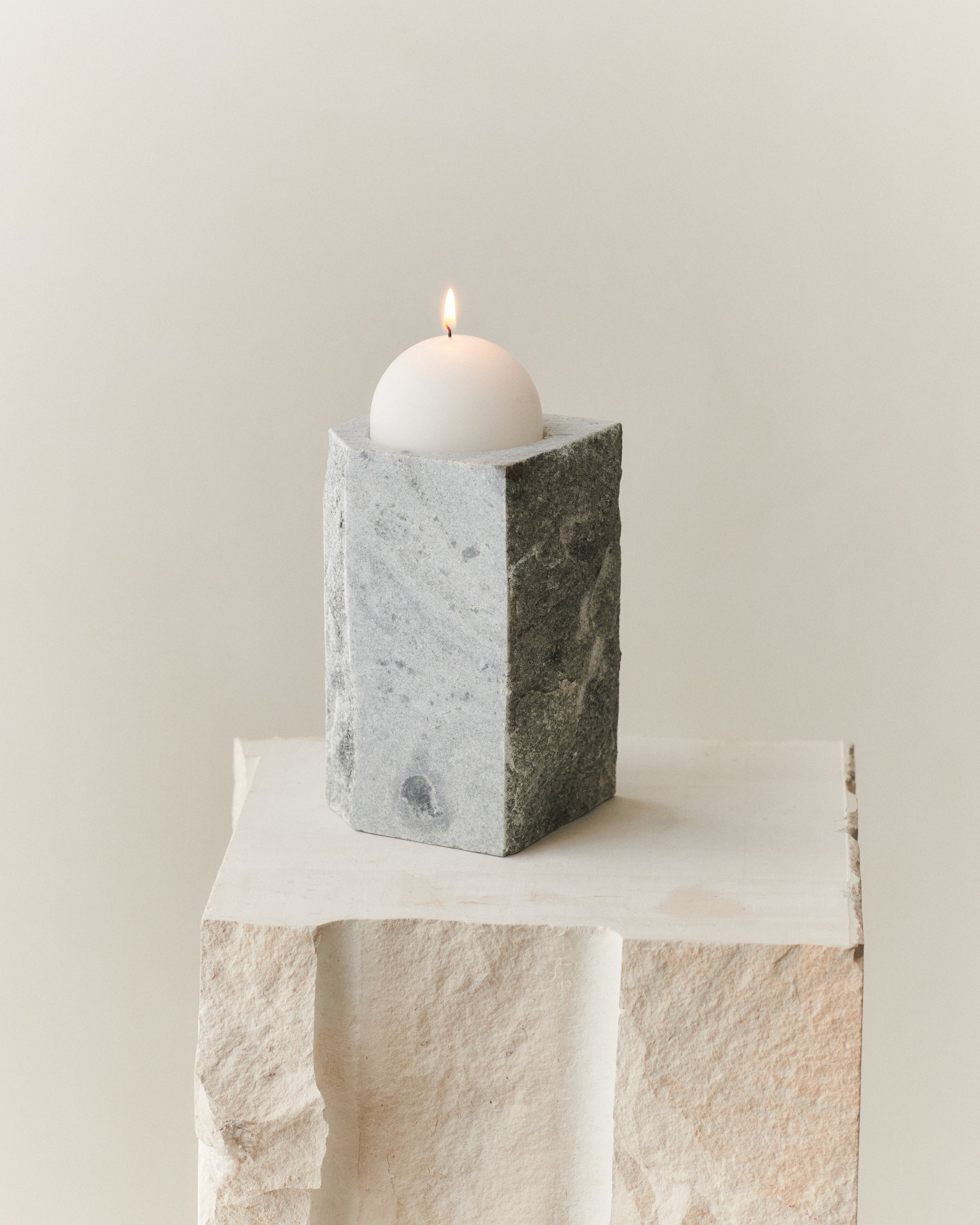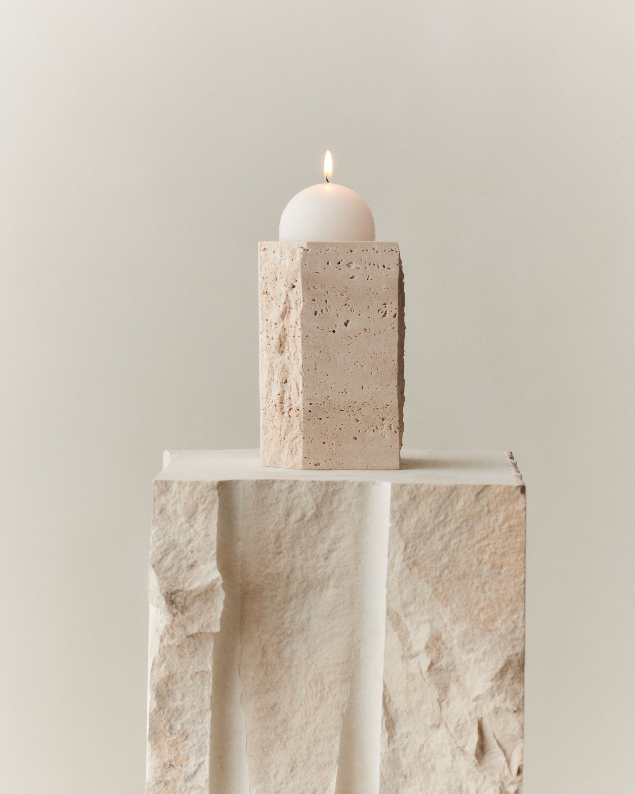 Each artistic object is characterized by a raw corner and side, displaying the authentic and lively layers of the stone material. Charmingly accentuated by a lit candle placed in its hollow, our Gallery Object Stone Candle Light stands notably unaccompanied too.