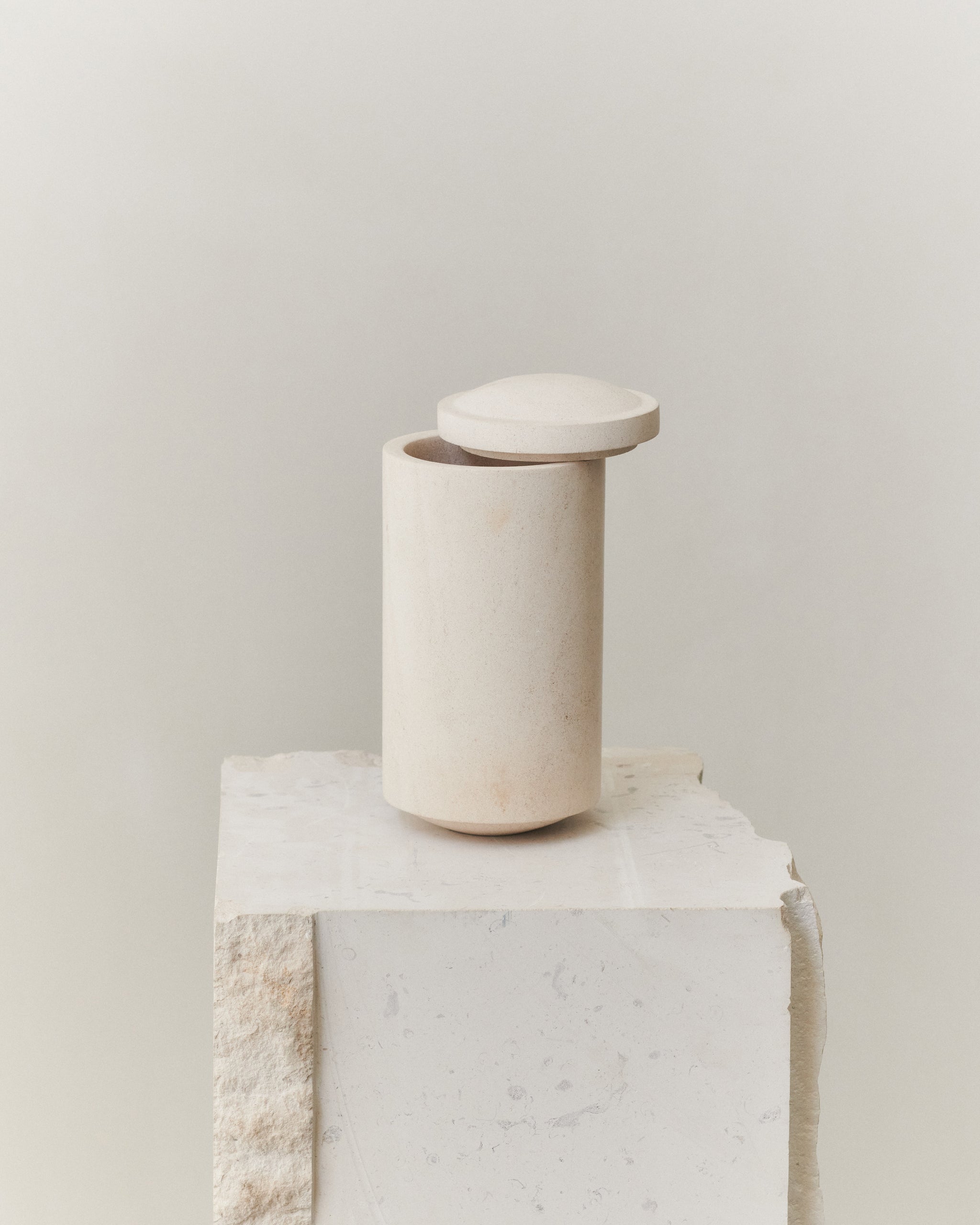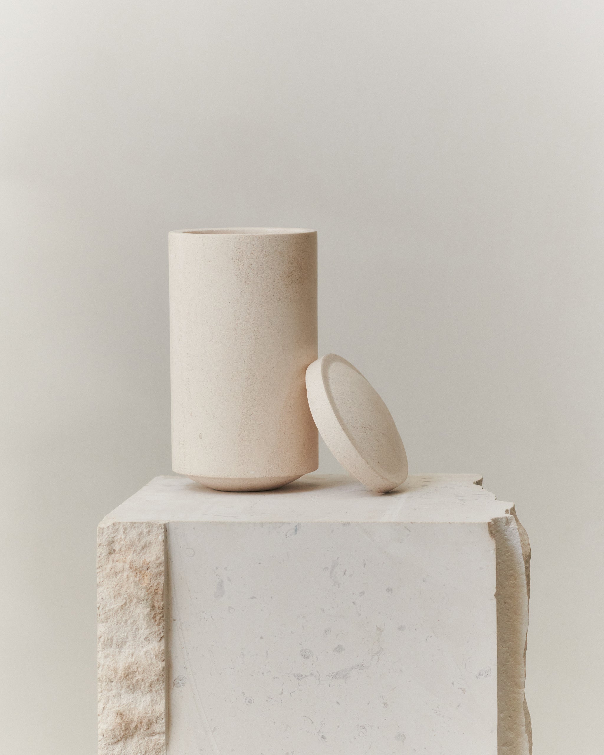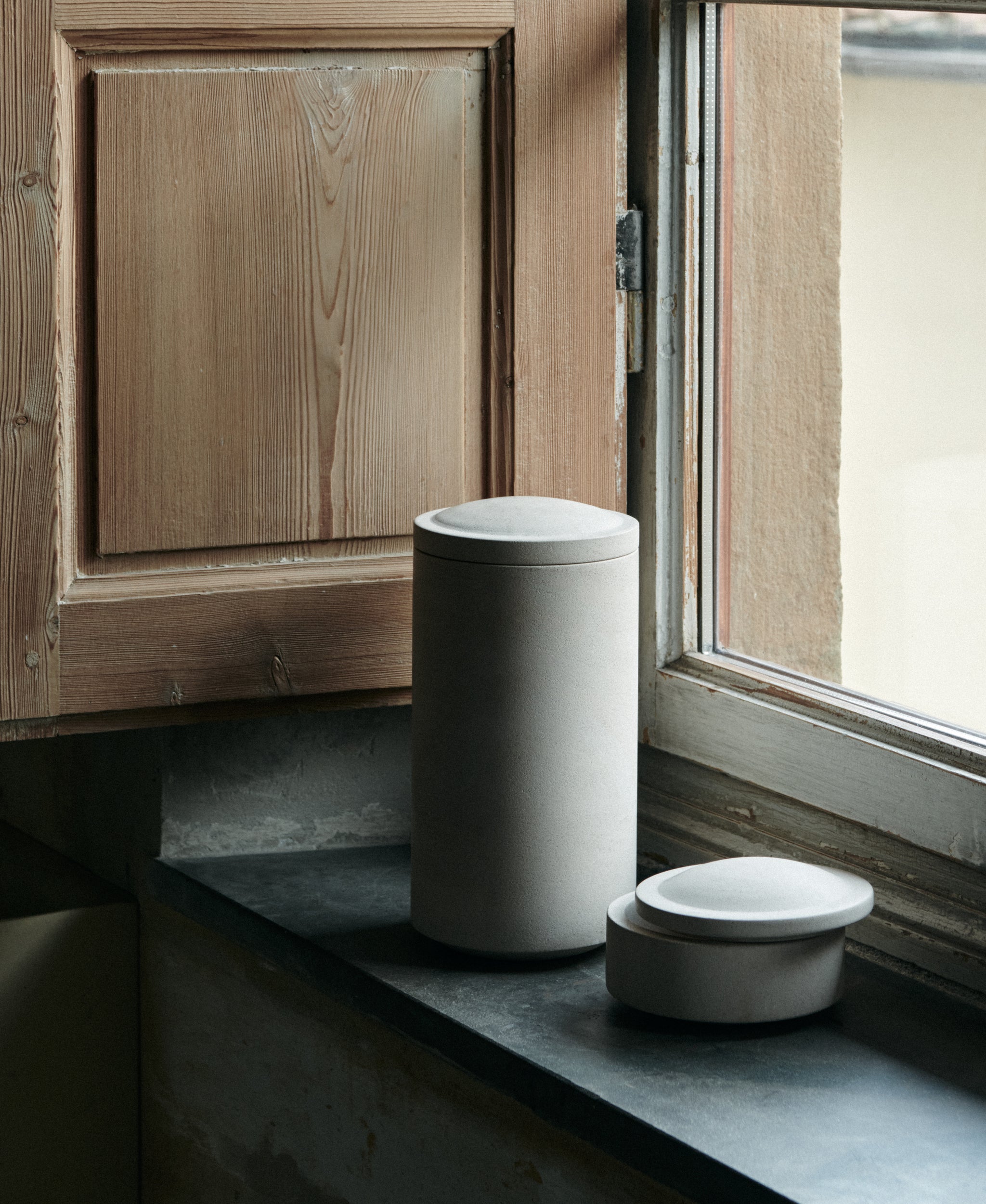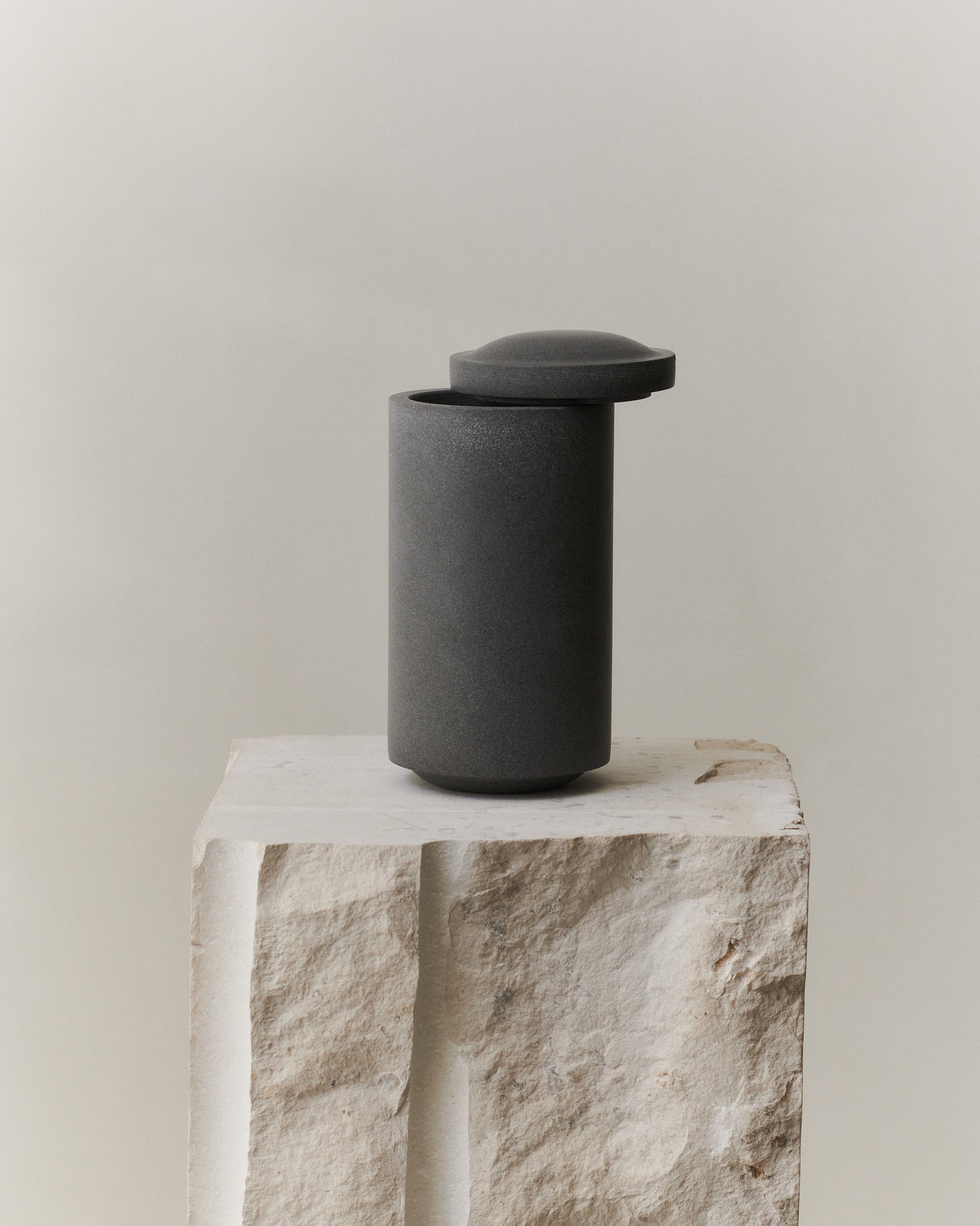 The Gallery Object series in stone from the LOUISE ROE collection includes diverse and size-varying jars, trays, bowls, and cake displays, available in two colorways: Black Basalt and Limestone.