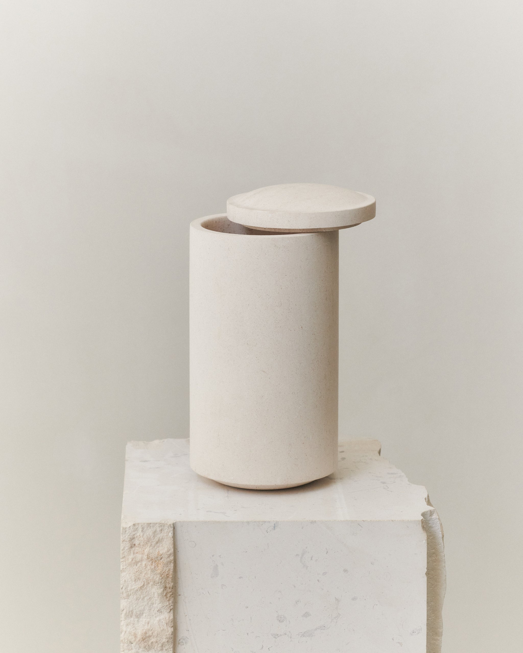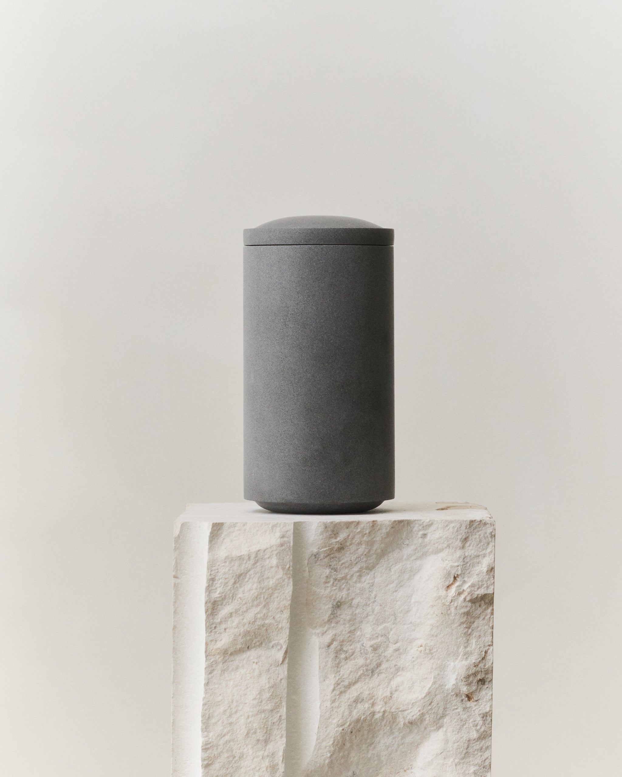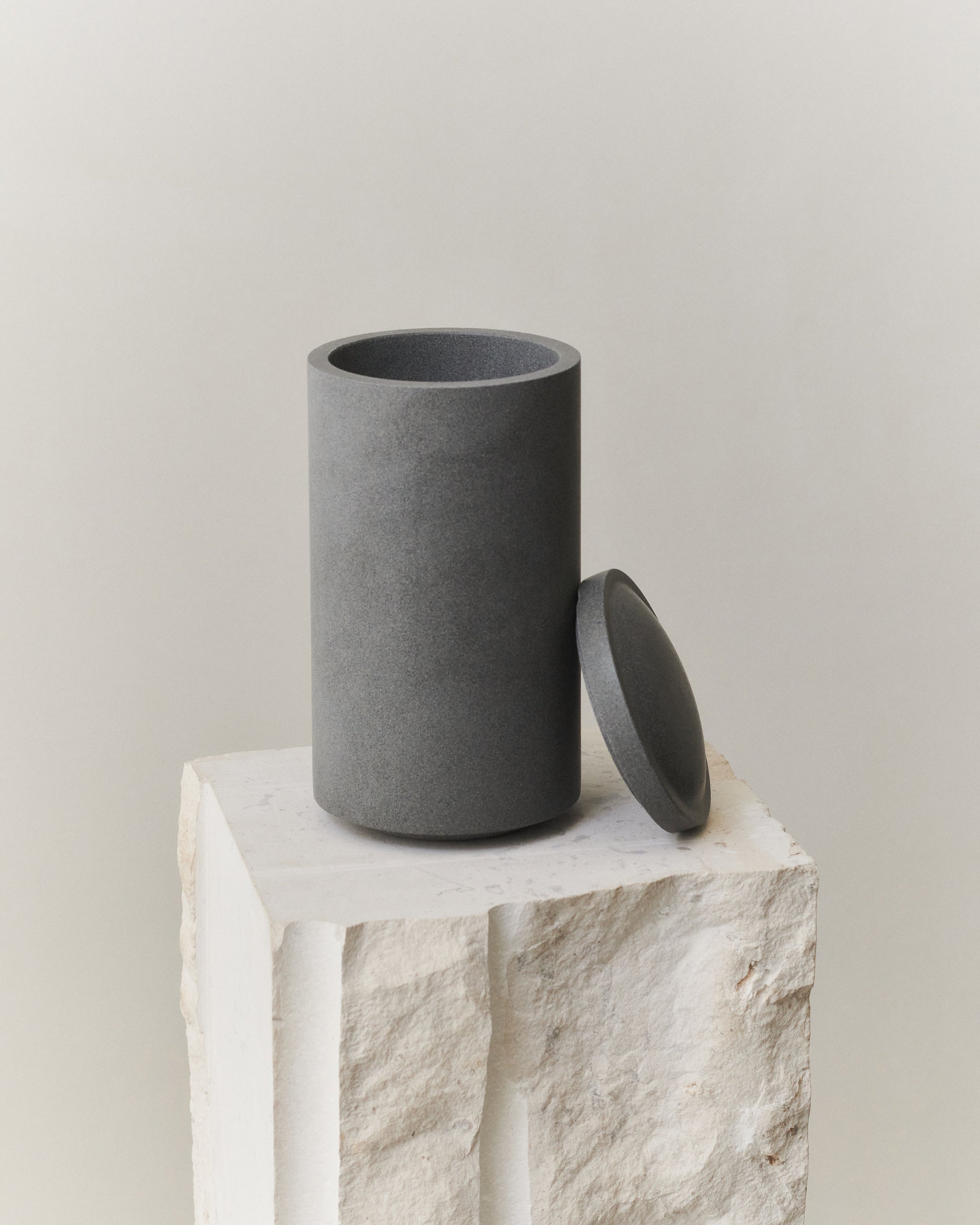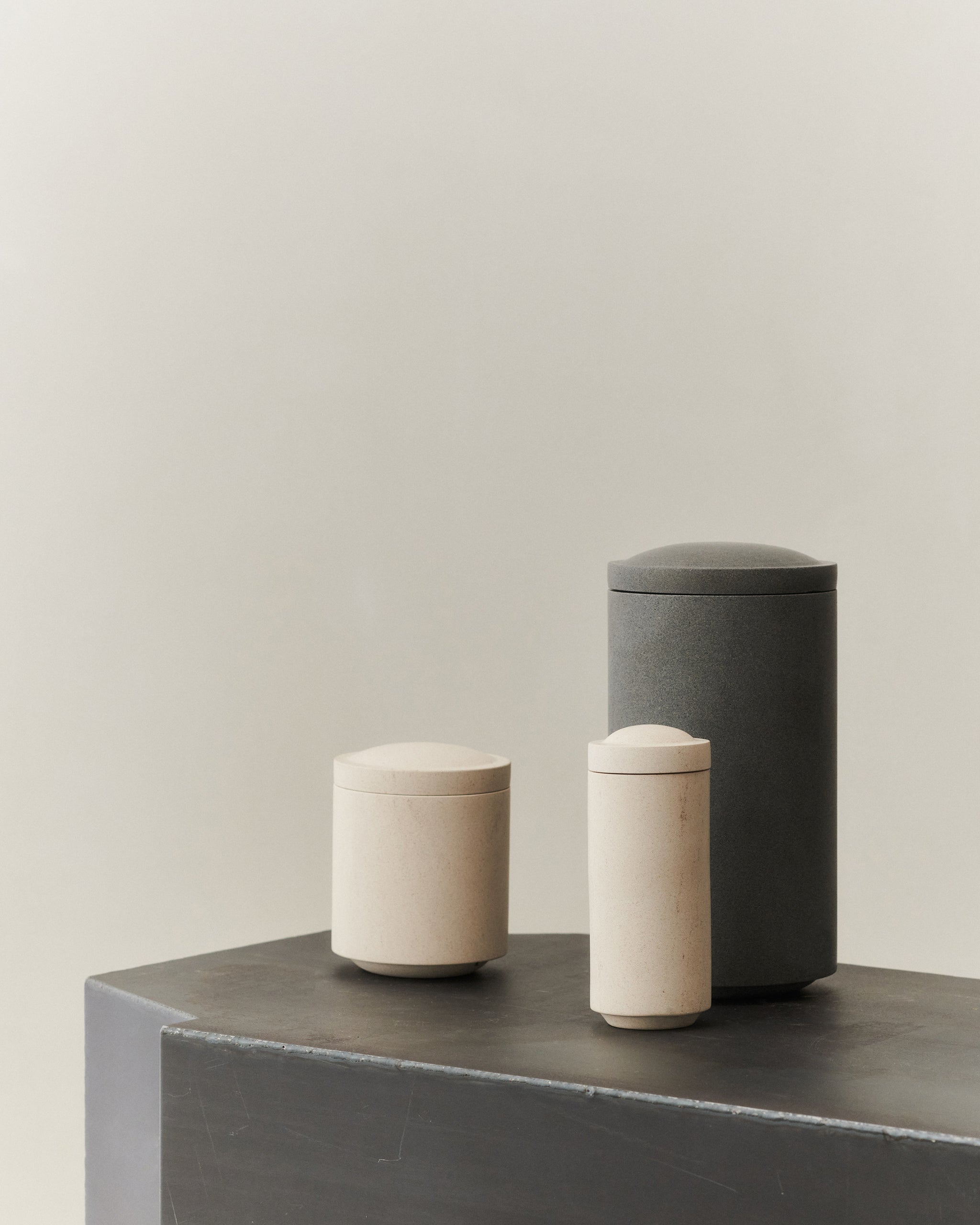 The Gallery Object series in stone from the LOUISE ROE collection includes diverse and size-varying jars, trays, bowls, and cake displays, available in two colorways: Black Basalt and Limestone.