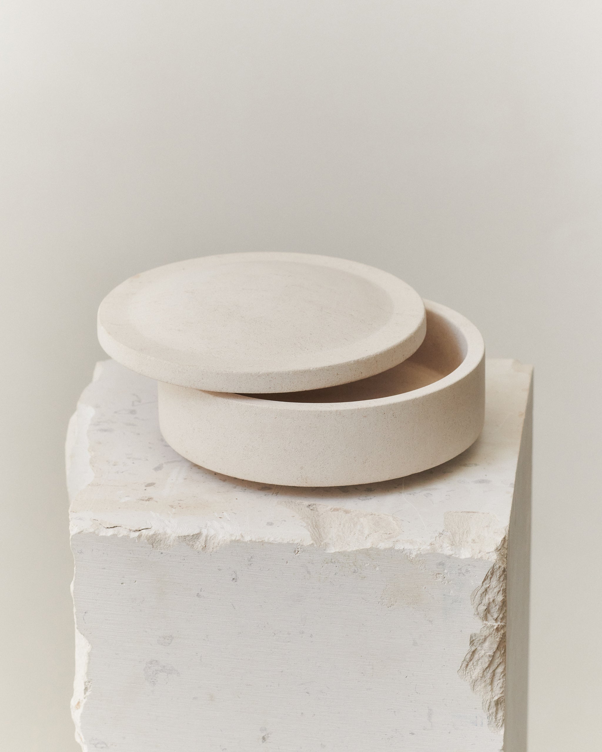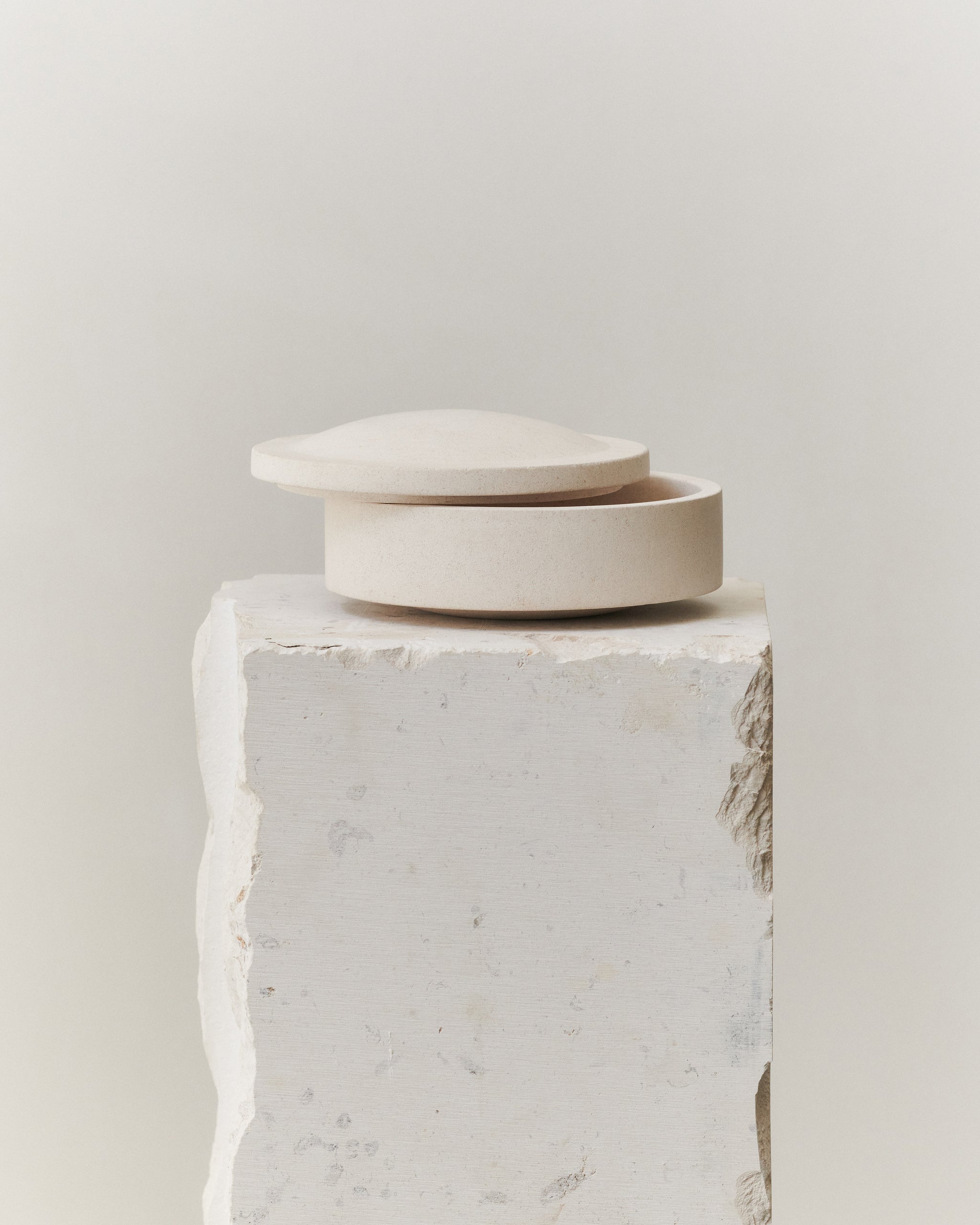 The Gallery Object series in stone from the LOUISE ROE collection includes diverse and size-varying jars, trays, bowls, and cake displays, available in two colorways: Black Basalt and Limestone.