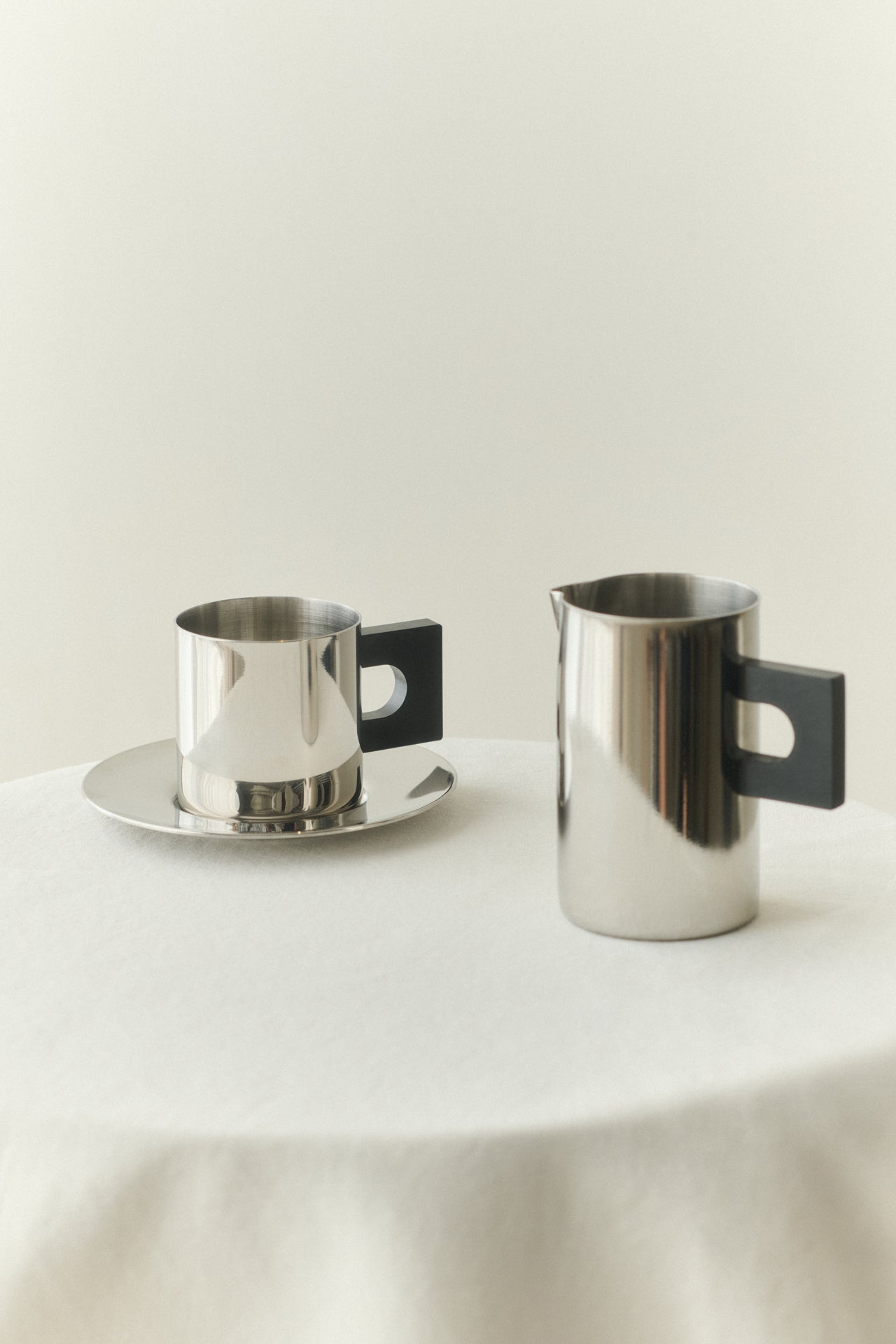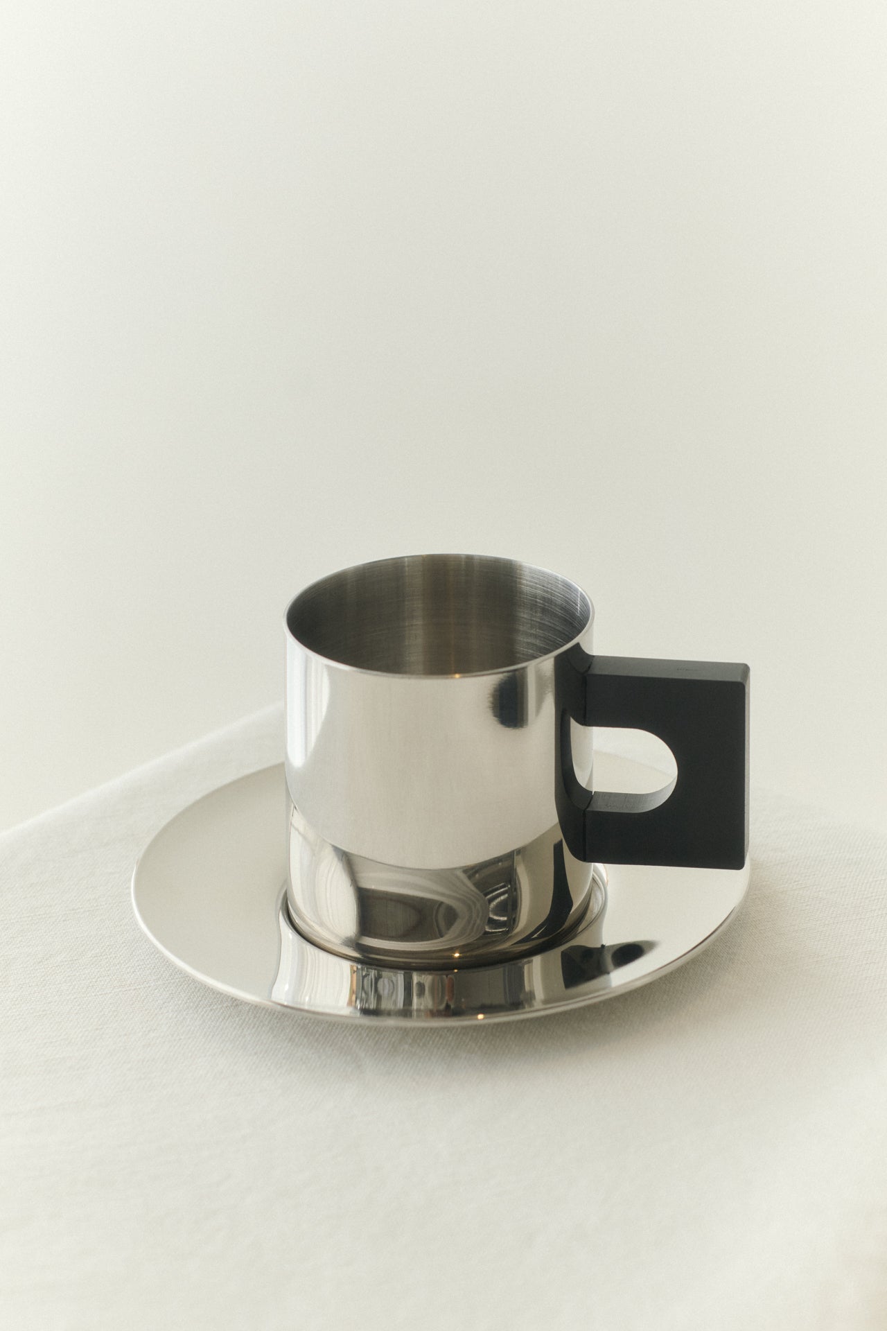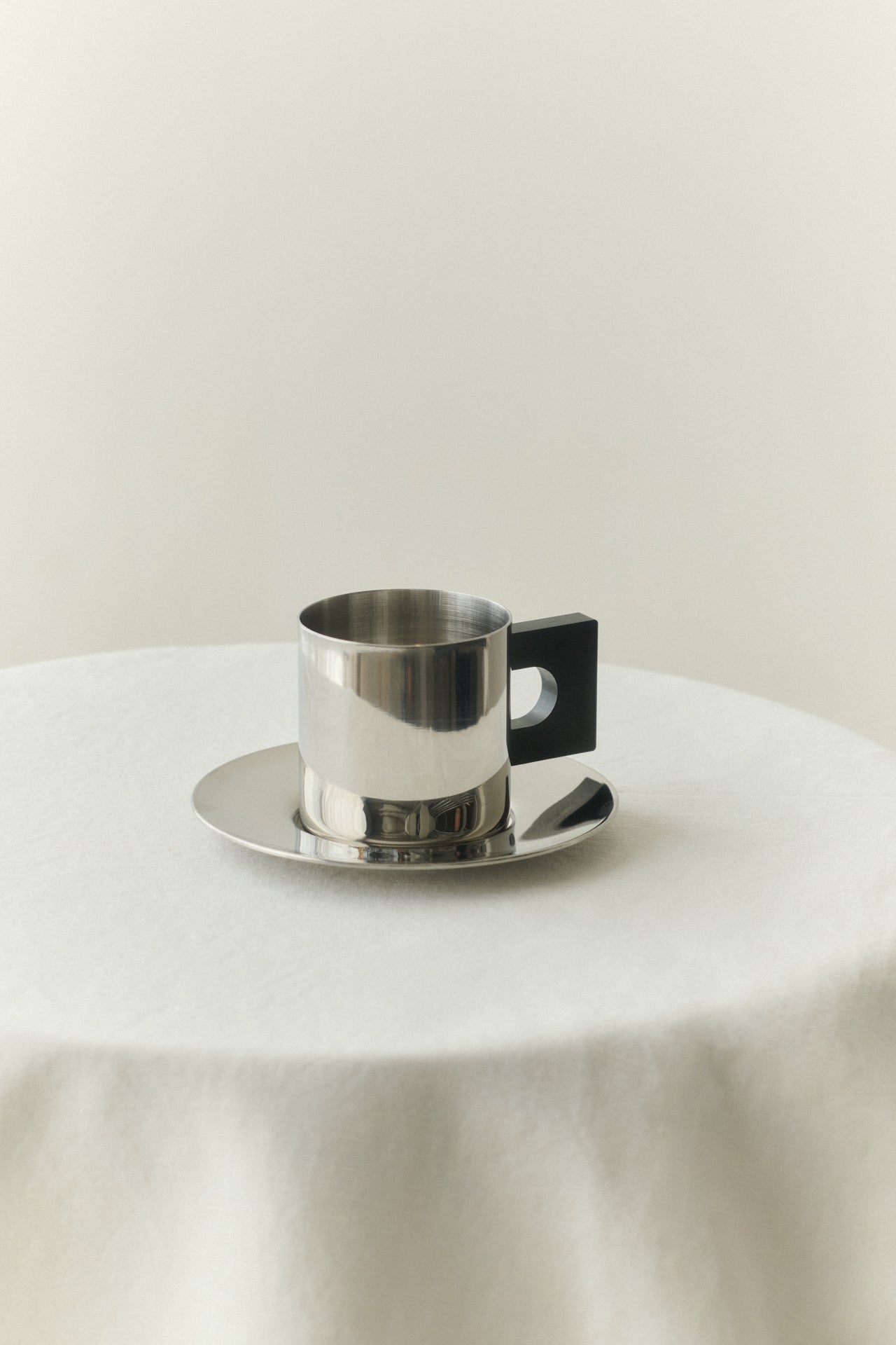 The S.R. Coffee Cup embodies a bold, streamlined aesthetic influenced by Bauhaus design. Its clean lines and metal construction lend a sleek, industrial quality, while the geometric handle introduces a refined, masculine element. Balancing modern aesthetics with enduring craftsmanship, its minimalist form and size emphasizes quality over quantity.