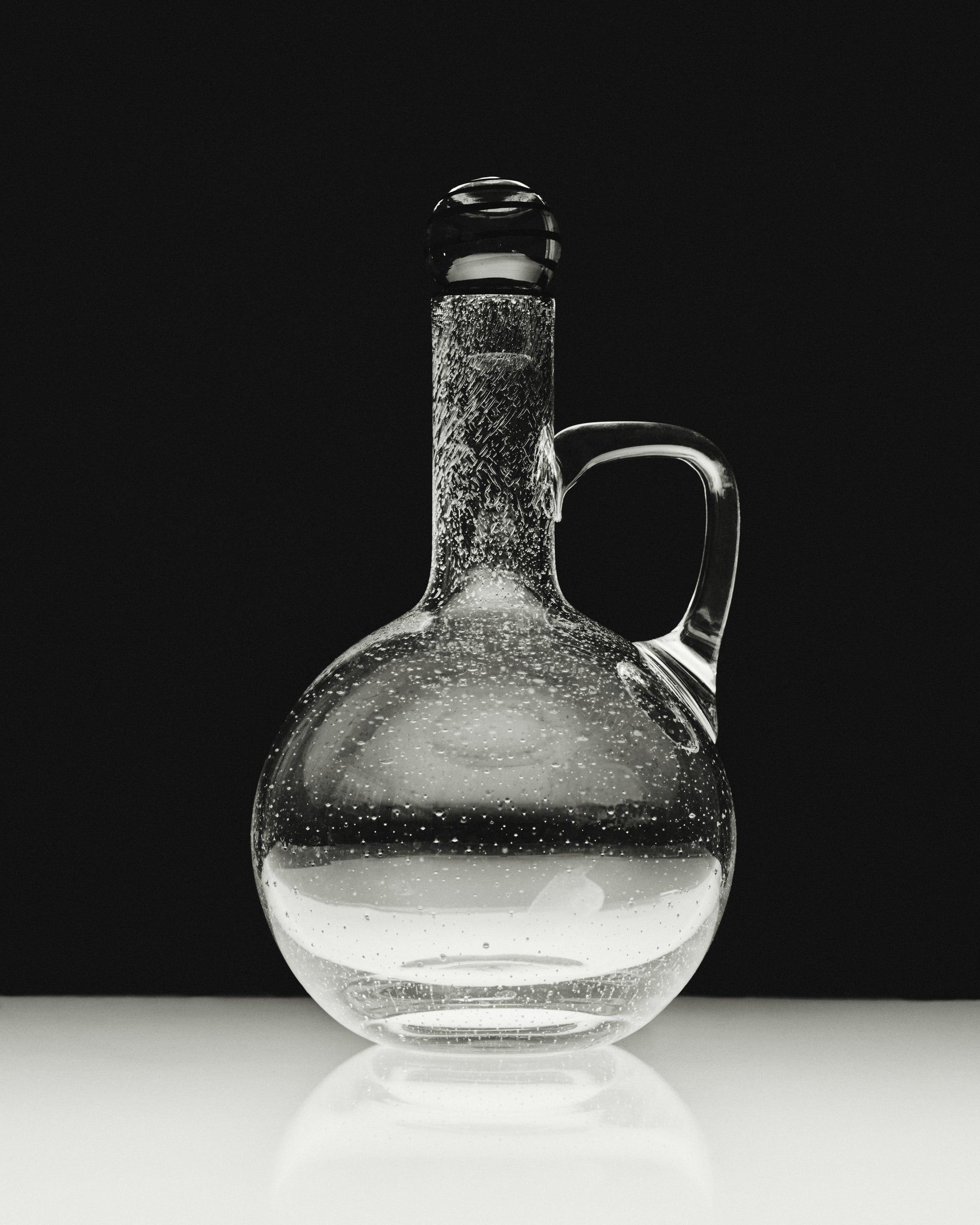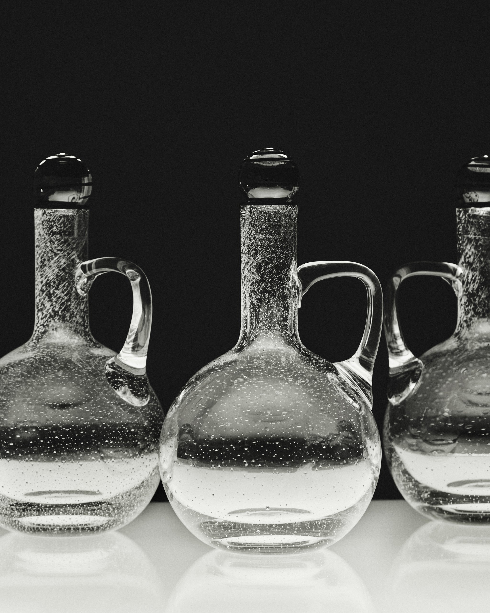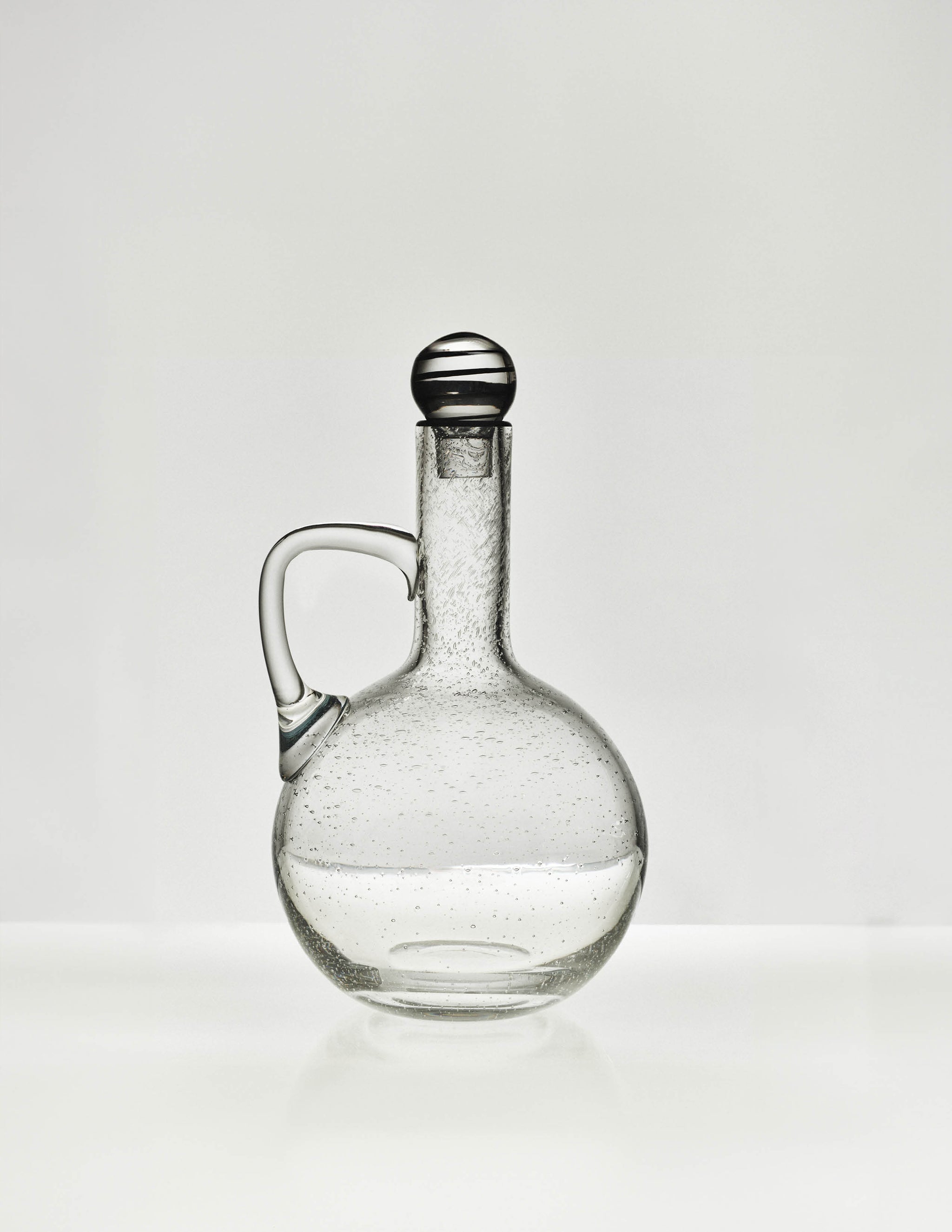 The S.R. Carafe elevates beverage service: the playful transparency invites one to explore the nuances of the chosen drink, whilst the distinctive figure alone endows the article center-piece character.