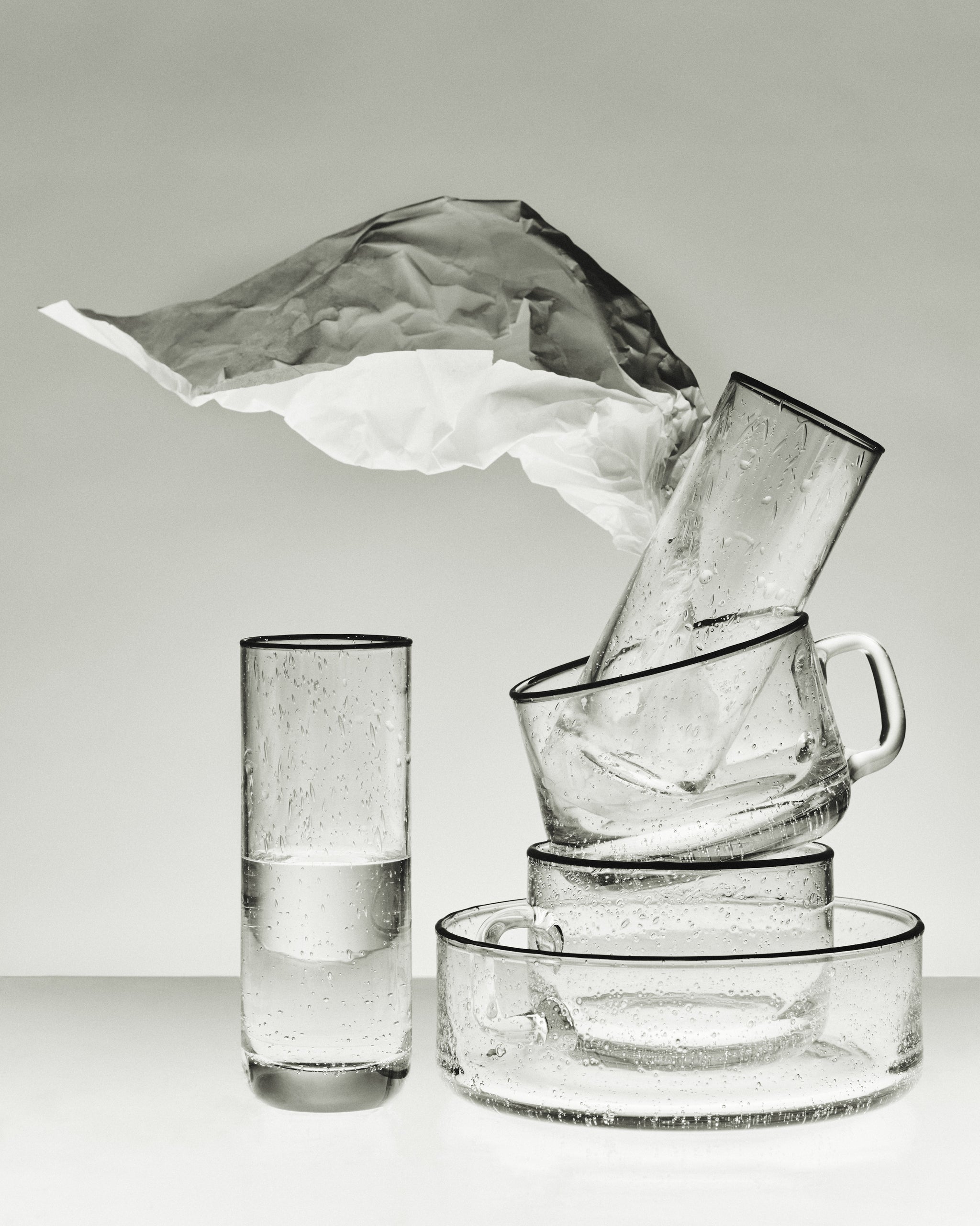 Characterized by their simplistic yet prominent black-rim detailing, Sophia’s Bubble Glass articles capture her take on the original array by LOUISE ROE. The assemblage commemorates the craftsmanship of glass-blowing, which endows each object an individual character and purposefully so.