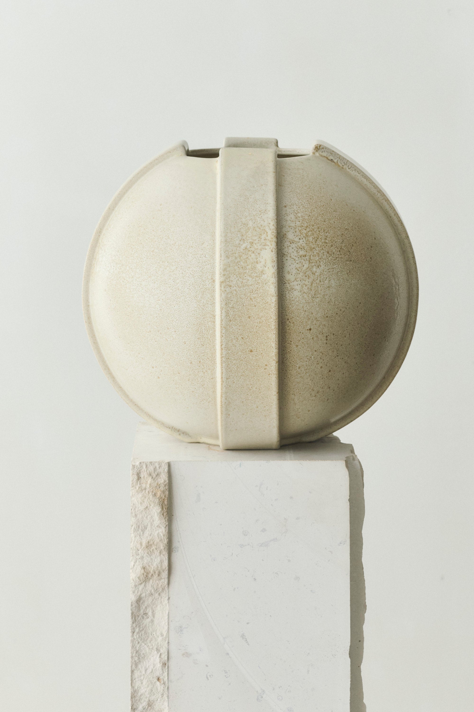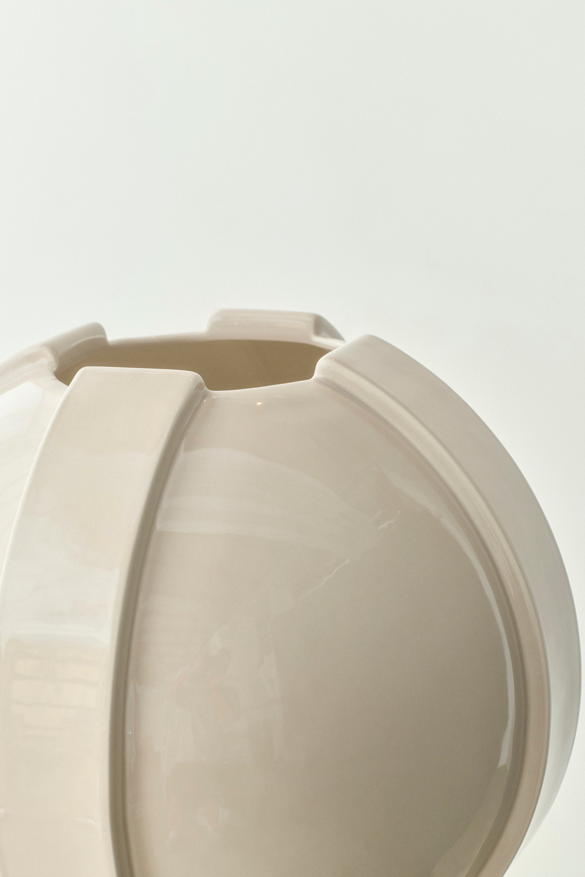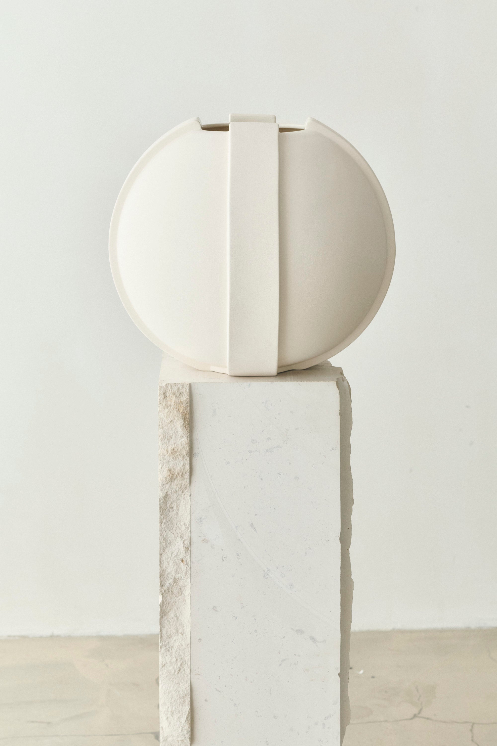 The VINCI Vase displays a round silhouette, accented by a belt-like band encircling its figure - a visual detail that metaphorically channels circular energy. Artisanally hand-molded in Portugal, it comes in two sizes. The larger impression is a grande sculpture, standing independently.